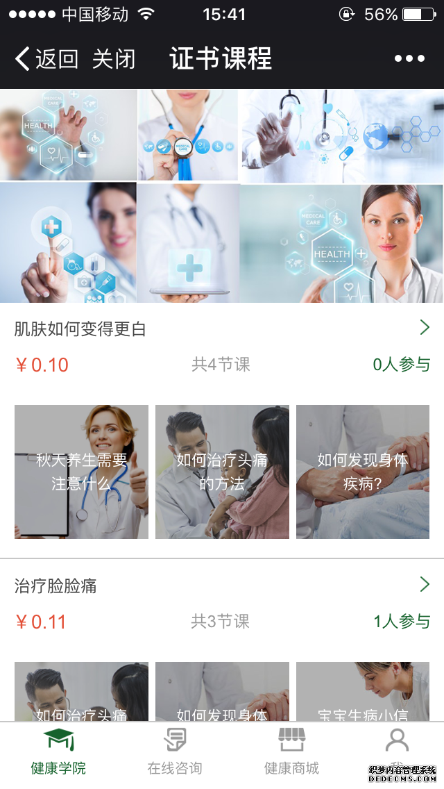 課程類別:按課程類別展示課程,課程類別可設置視頻課程、音頻課程、圖文課程、付費課程等多種屬性。